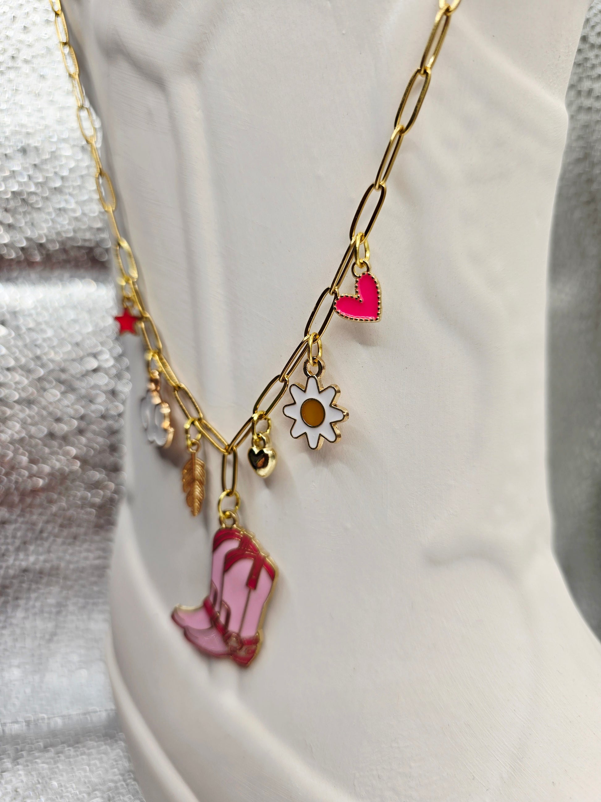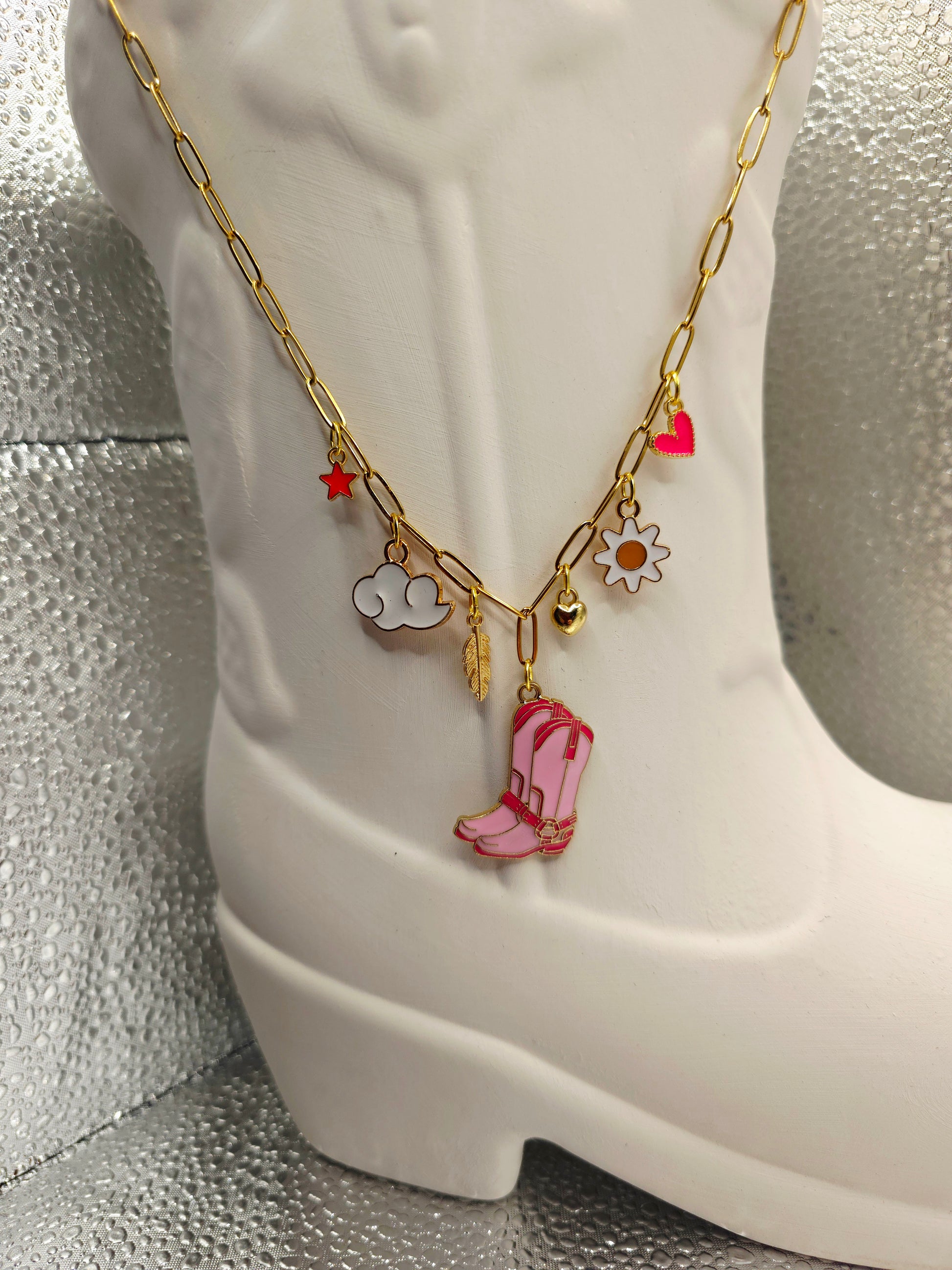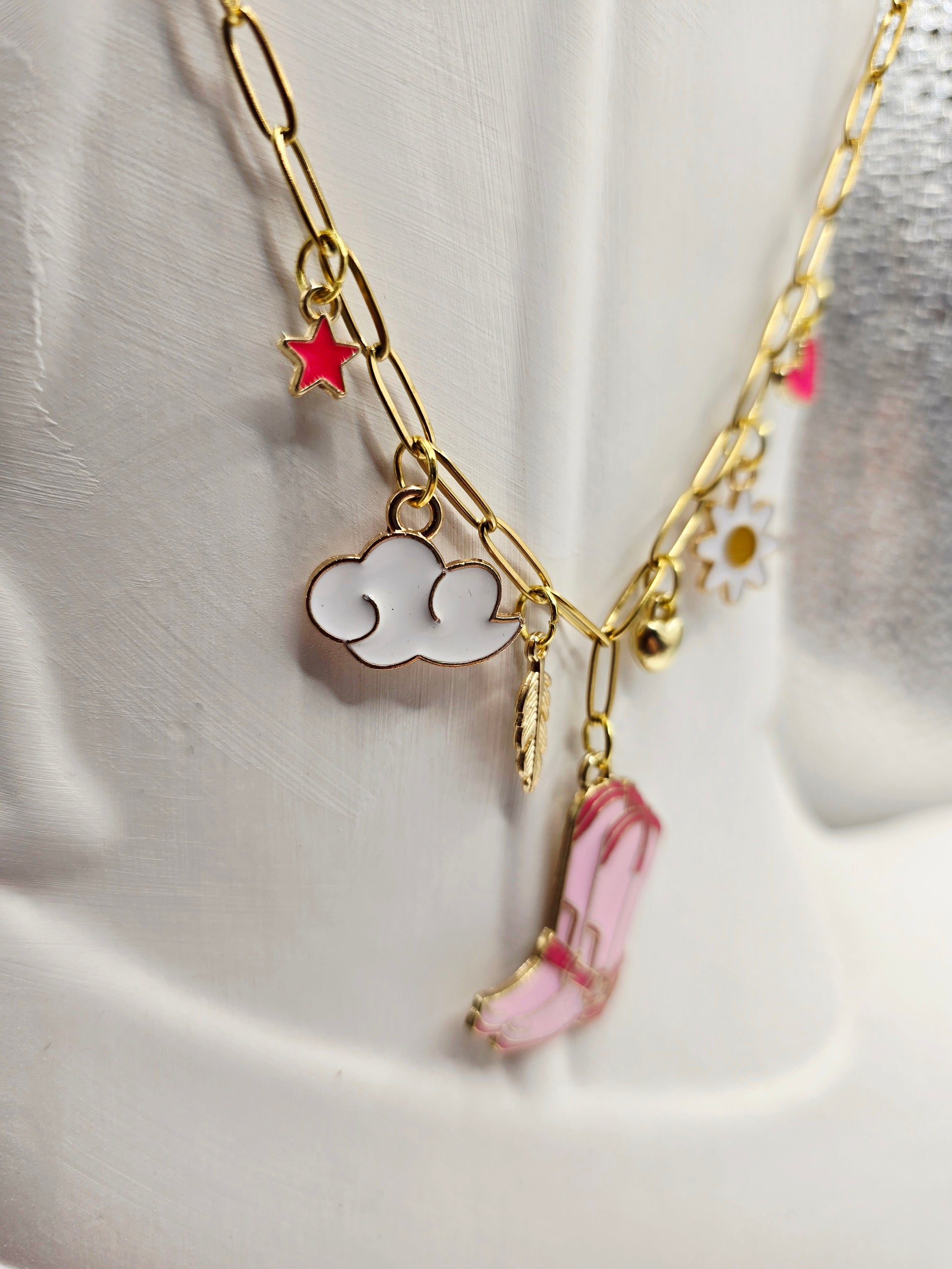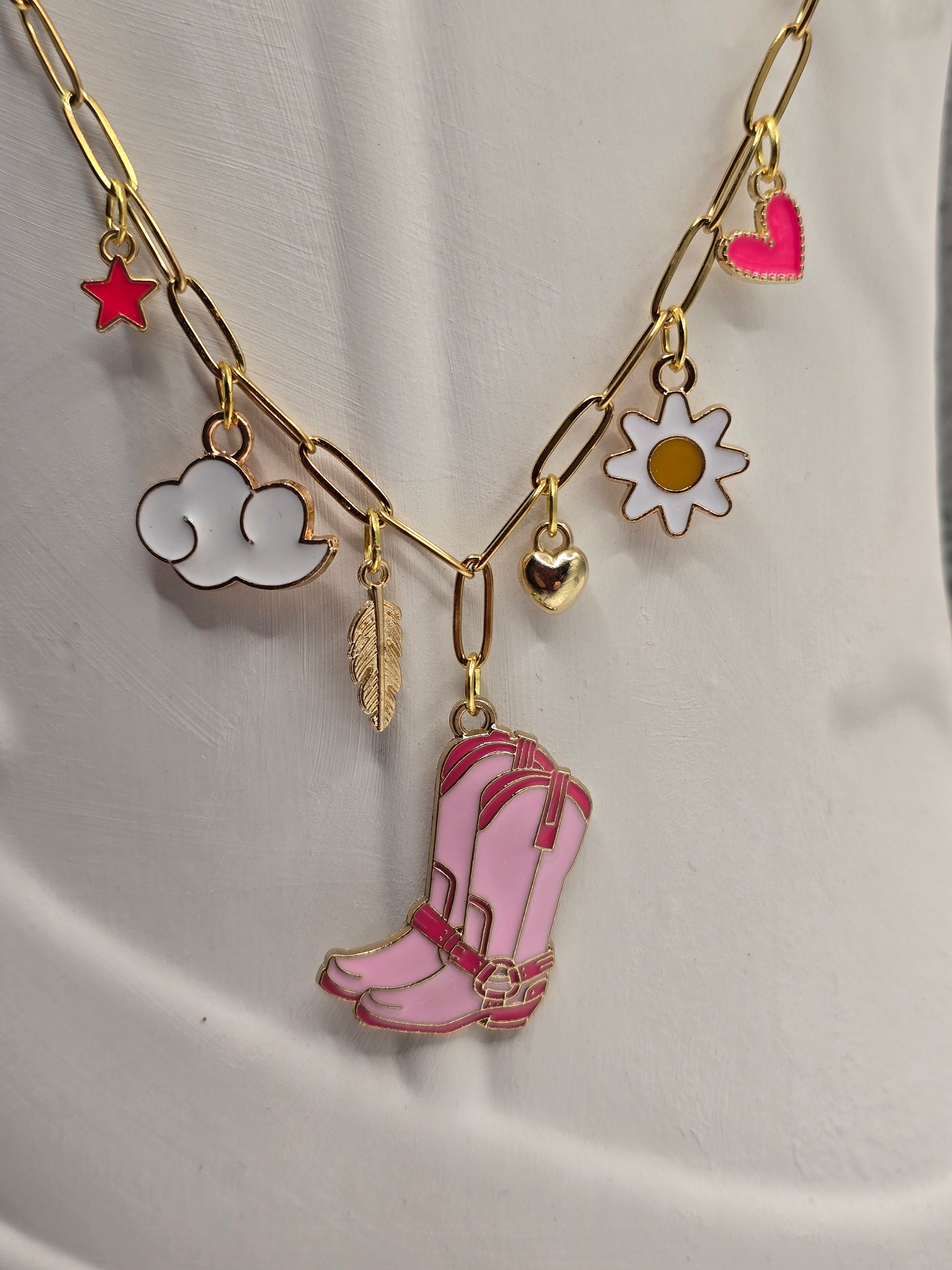 ​Made for bubblegum moods, loud laughs, and girls who never outgrew the fun stuff. This piece is a curated collection of whimsy—from iconic pink boots to drifting clouds—designed to turn every outfit into a statement. Whether you’re romanticizing your morning coffee or dancing through festival season, this necklace is your new favorite sidekick for chasing sunbeams and making memories.
