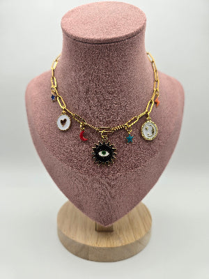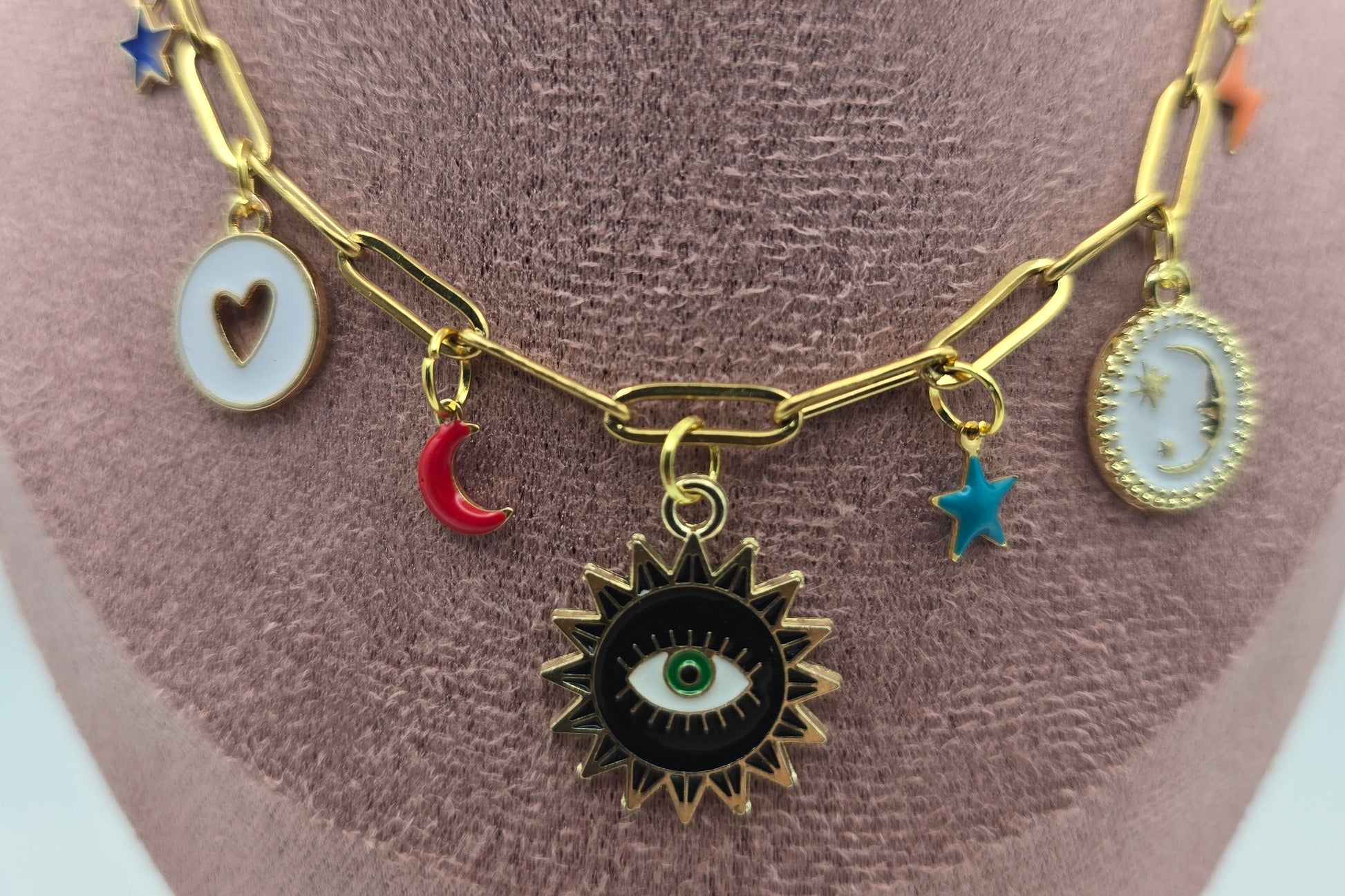 Gentle Guardian is a softly celestial charm necklace designed to bring calm, comfort, and quiet protection. With moonlit details, tiny stars, and a watchful eye at its centre, it’s a piece that feels like being held by the universe - subtle, soothing, and full of trust in the unseen.